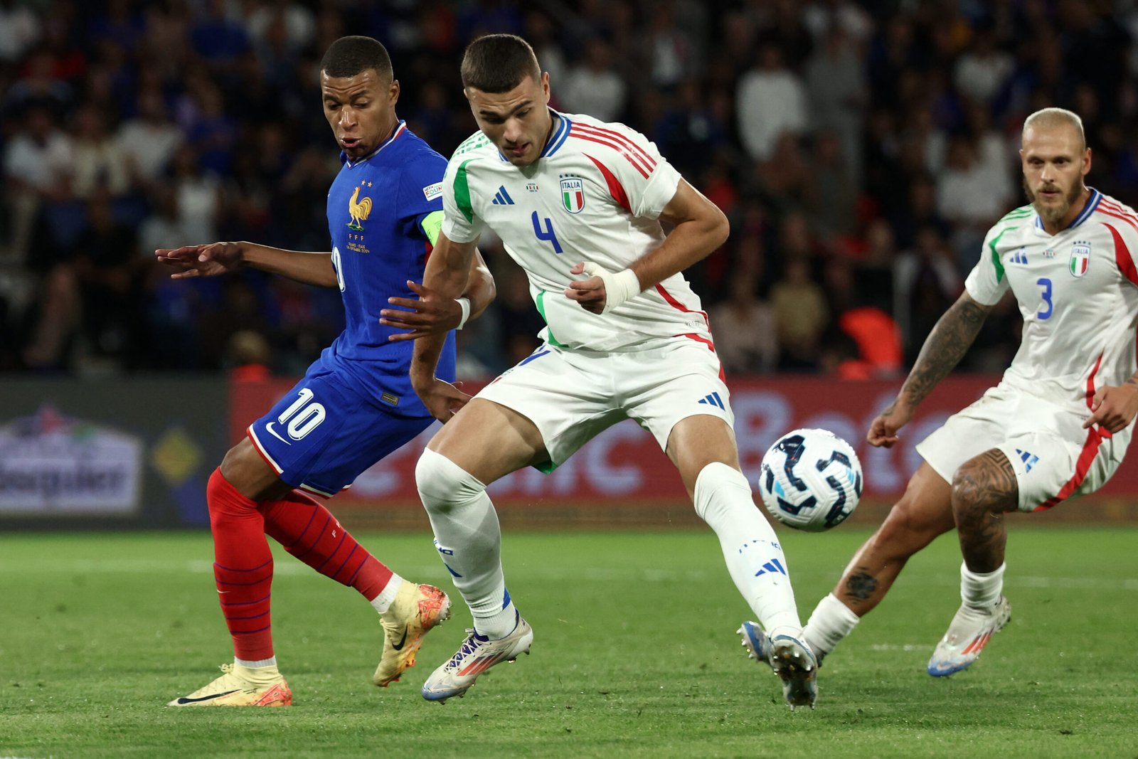 En la segunda mitad, Italia continuó dominando el ritmo del partido. Con un enfoque más pausado, negaron el control del balón a los franceses y aprovecharon cada error para lanzar peligrosas contras. En una de estas transiciones, Fofana perdió el balón en el centro del campo, lo que desencadenó una rápida jugada que terminó con Davide Frattesi anotando el segundo gol (50′) para Italia tras un preciso centro de Retegui.