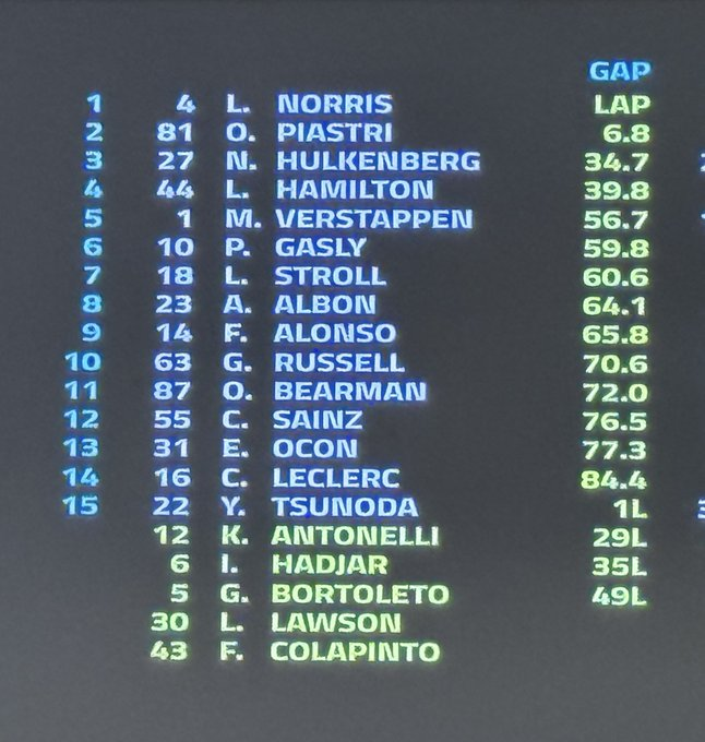 En la radio, Piastri pedía cambio de posición al final de la carrera con Norris, mientras que Leclerc se volvió a salir de pista y se hundía aún más en la posición 14 de la carrera. McLaren le indicó al australiano que no habría órdenes de equipo, por lo que el resultado se mantuvo igual.